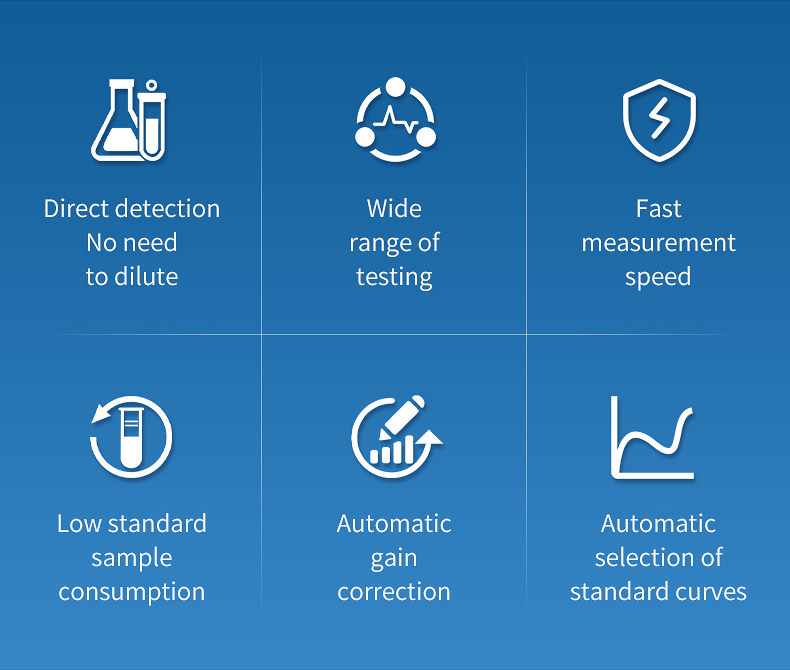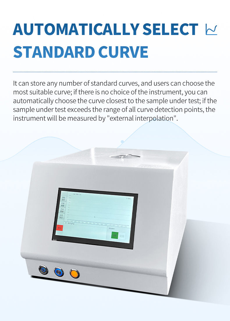 8. Automatic selection of standard curves: The instrument can store any number of standard curves, and users can choose the most suitable curve; If there is no selection, the instrument can automatically select a curve that is closest to the measured sample; If the tested sample exceeds the range of all curve measurement points, the instrument will use the "extrapolation method" for measurement.