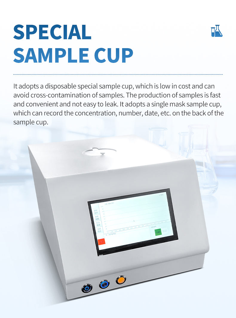 5. Specialized sample cup: using disposable specialized sample cups, low cost, can avoid sample cross contamination; Sample production is fast, convenient, and not prone to leakage; The single facial mask sample cup can be used to record the sample concentration, number, date, etc. on the back of the sample cup.