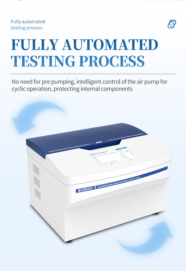 The fully automatic pour point analyzer is mainly used for measuring the pour point value of petroleum products. It is a pour point/pour point measurement equipment that integrates automation, intelligence, and high precision. Through innovative temperature control technology and automatic air pressure detection system, the pour point and pour point of liquid samples can be quickly and accurately determined.