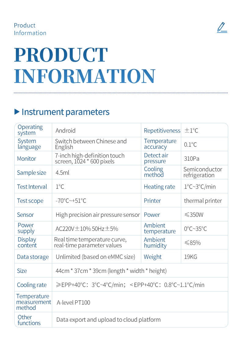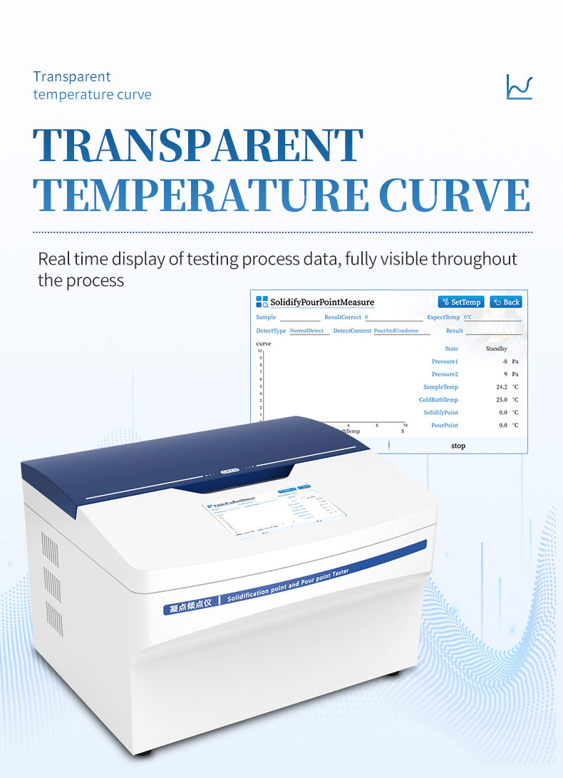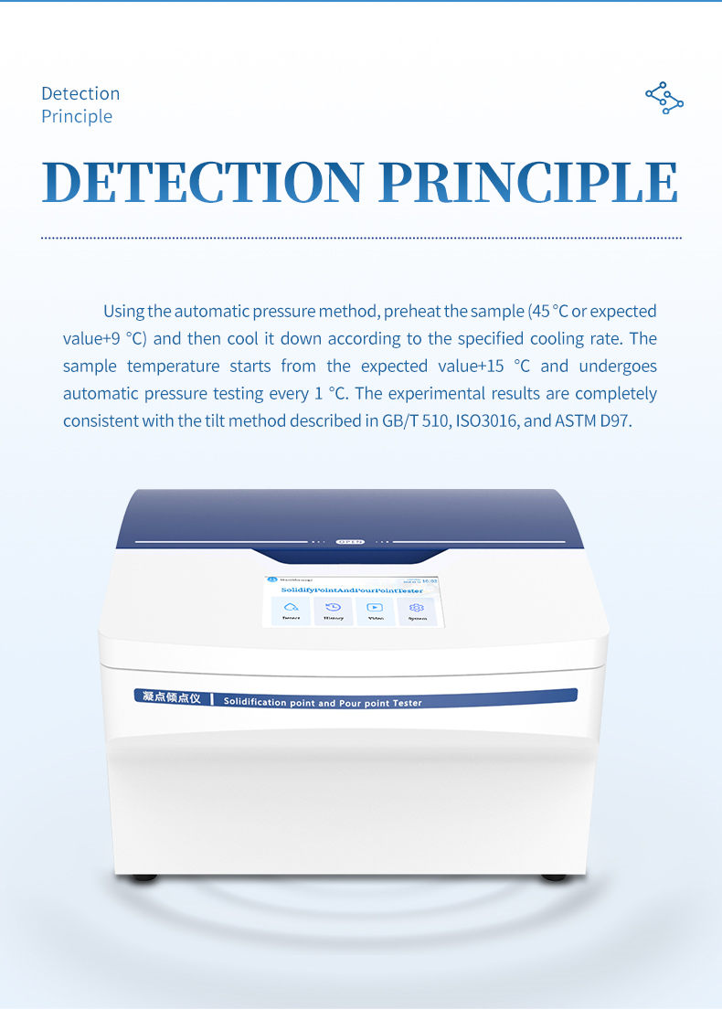 Using the automatic pressure method, preheat the sample (45 ℃ or expected value+9 ℃) and then cool it down according to the specified cooling rate. The sample temperature starts from the expected value+15 ℃ and undergoes automatic pressure testing every 1 ℃. The experimental results are completely consistent with the tilt method described in GB/T 510, ISO3016, and ASTM D97.