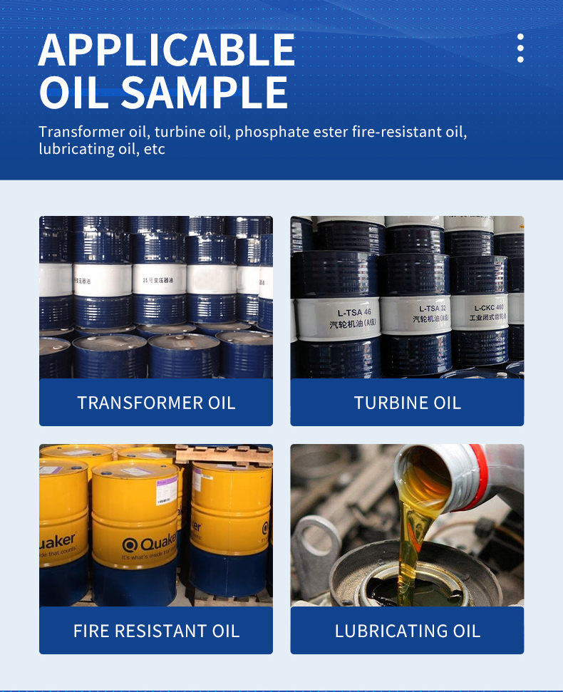 8. Applicable oil samples: transformer oil, turbine oil, phosphate ester fire-resistant oil, lubricating oil, etc