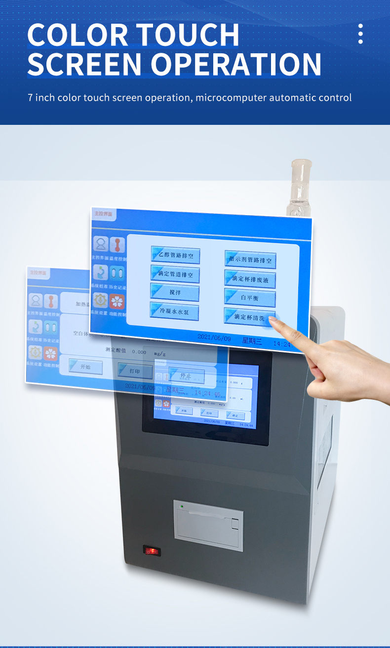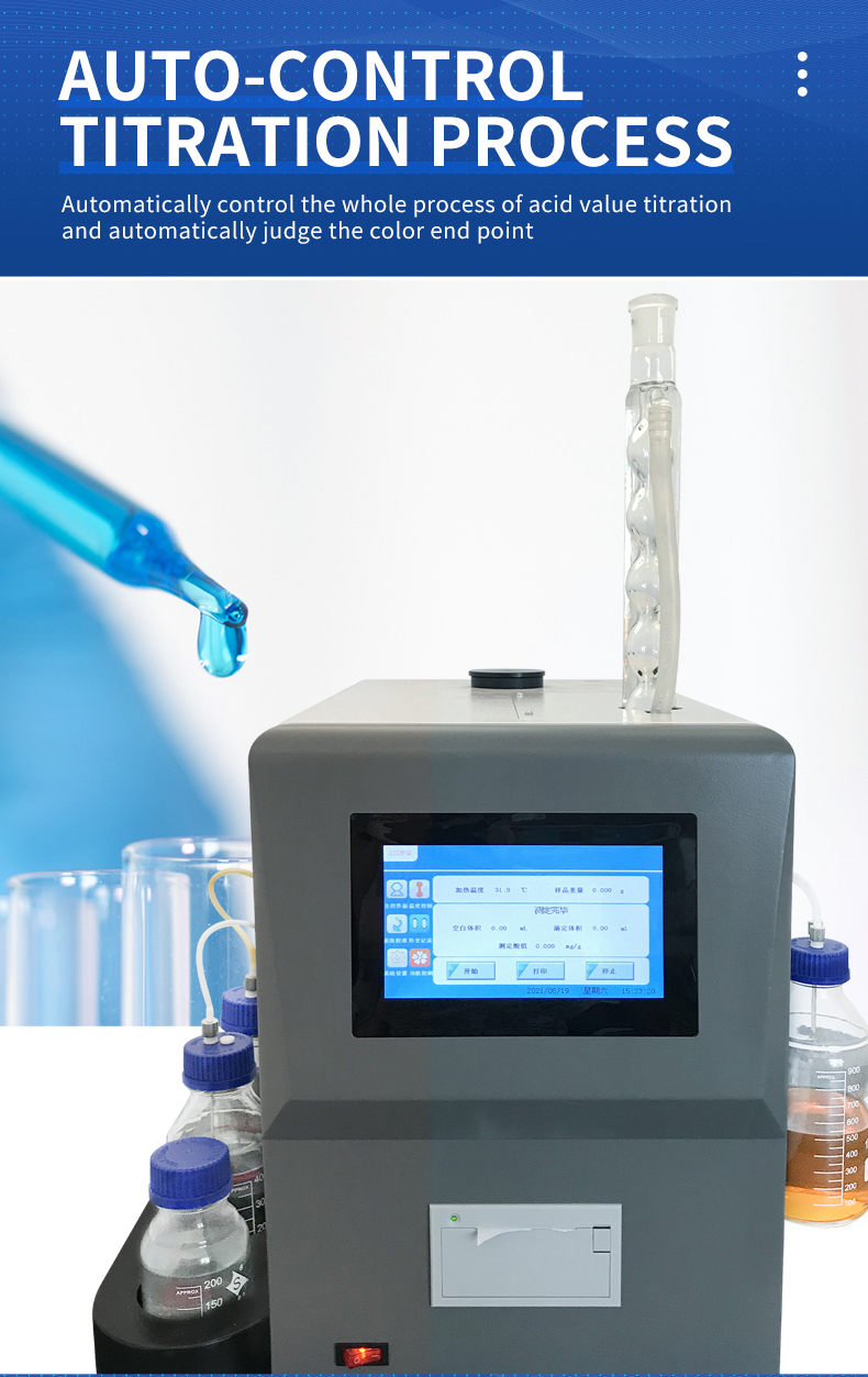 3. Automatically control the entire process of acid value titration and automatically determine the color endpoint.
