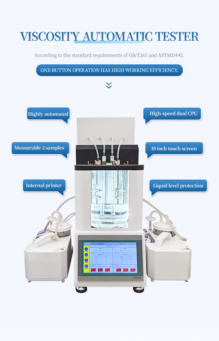 This product's petroleum product kinematic viscosity automatic measuring instrument is a specialized testing instrument designed and manufactured in accordance with the national standard GB265-88 Petroleum Product Kinematic Viscosity Measurement Method, suitable for measuring the kinematic viscosity of liquid petroleum products. This instrument has a timed sample movement time and automatically calculates the final result of motion viscosity. This method is suitable for determining the kinematic viscosity of liquid petroleum products (referring to Newtonian liquids), with the unit of m2/s, usually used in practice as mm2/s. The dynamic viscosity can be obtained by multiplying the measured kinematic viscosity by the density of the liquid. This method measures the time it takes for a certain volume of liquid to flow through a calibrated glass capillary viscometer (Pin's, Ubbelohde's) under gravity at a constant temperature. The product of the capillary constant of the viscometer and the flow time is the measured kinematic viscosity of the liquid at that temperature. The product of the kinematic viscosity at that temperature and the density of the liquid at the same temperature is the dynamic viscosity at that temperature.